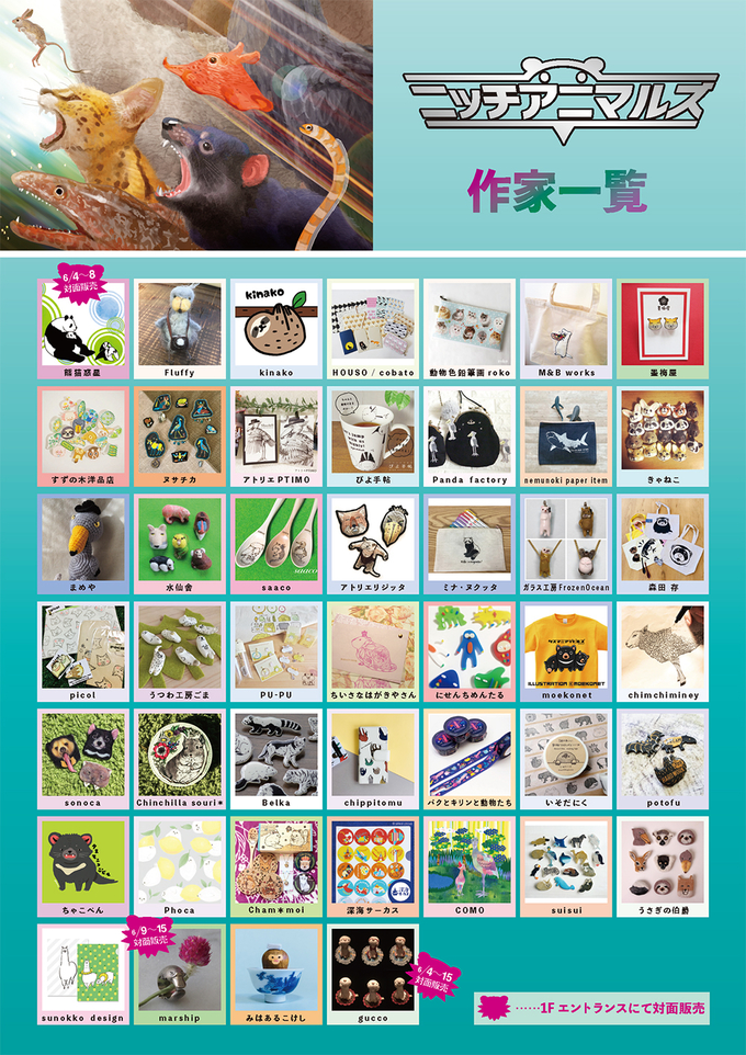 出張イベント 6/1(金) ~ 6/17(日)『ニッチアニマルズ4 脇役動物下克上』東急ハンズ池袋店 『ニッチアニマルズ4 脇役動物下克上』 会場:東急ハンズ池袋店1階 会期:6/1(金) ~ 6/17(日) [Show thumbnails] 2018-06-05 | Posted in 出張イベント | Comments Closed 関連記事 11/22(金) ~ 2020/1/16(木)『HANDS on NIPPON』東急ハンズ広島店2階 10/2(水)~10/31(木)『さいたまクリエイターZOO』東急ハンズ大宮店5F 10/1(火)~10/31(木)『アクセサリーガーデン Accessories Garden』東急ハンズ横浜店6F 10/18(金)~10/30(水)『吉猫〜にゃんこ クリエイターズ』吉祥寺PARCO 4F 10/15(火)~10/21(月)『Accessories Garden』武蔵小金井nonowa < 6/2(土) ~ 7/8(日)『トリトブ部屋 in ヨコハマ』東急ハンズ横浜店 6/18(月) ~ 7/3(火)『紙フェス』東急ハンズ池袋店 >